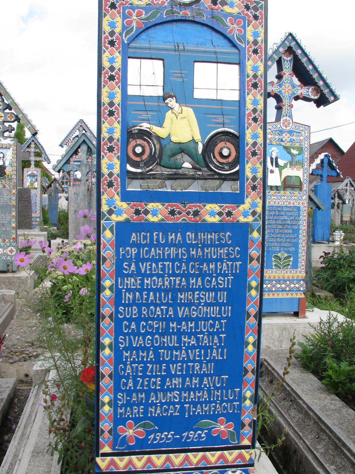 Then there is an other peculiarity… it’s really unique in the world… it’s “the cheerful cemetery”. This cheerful cemetery is located a few kilometers from the village of Sighetu Marmatiei and more precisely in the village of Sapanta, near the border with Ukraine.