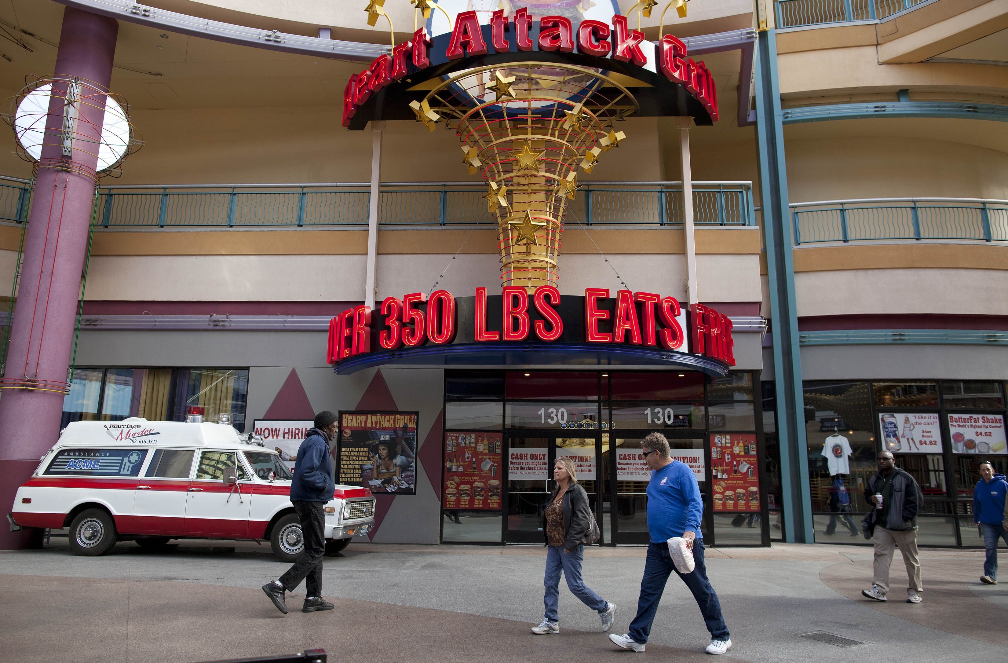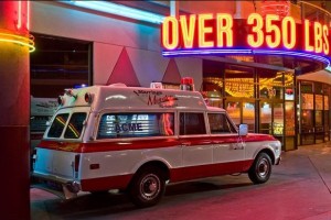 Heart Attack Grill è un ristorante a tema “ospedale” che serve principalmente hamburger e patatine fritte. Vi verrà dato un camice da paziente ospedaliero (fate in modo di non macchiarlo con le salse…) e delle infermiere (ragazze vestite come infermiere, non infermiere vere!) vi serviranno i pasti.